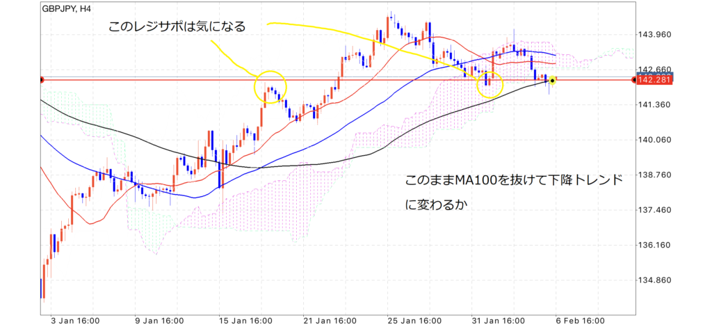 レジサポラインとMA100が気になるところだが、長いことウジウジしているし安値も更新し始めている。