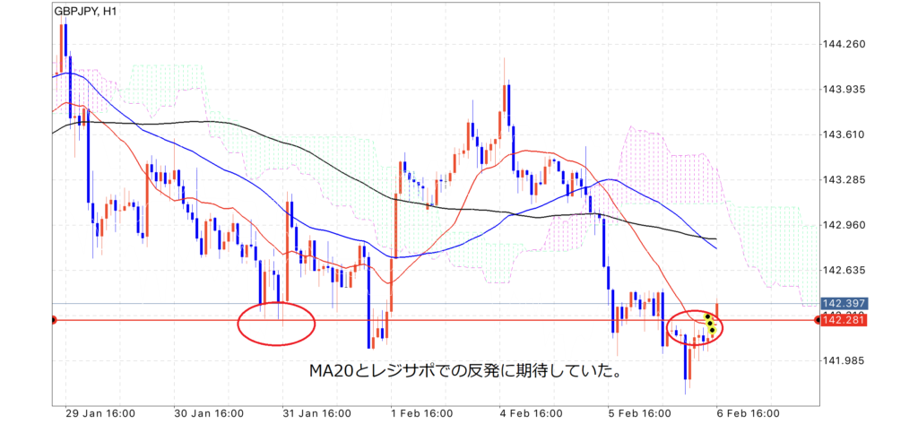 このまま安値を更新していくと思いきや、勢いよくMA20とレジサポをブレイク