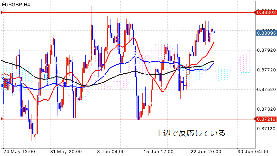 4時間足を見ても上辺で反応している感がしっかり出ています。