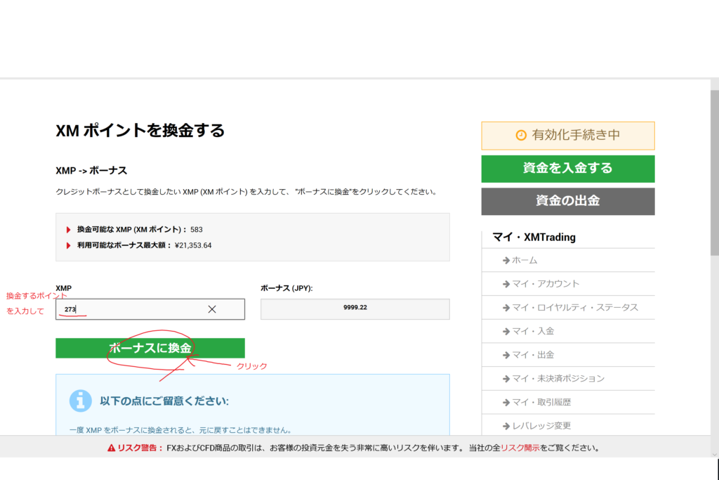 このポイントをトレード専用のクレジット(証拠金扱い)に交換するか、現金として交換するかは自由ですが、換金率はトレード用のクレジットにする方が10倍以上お得です。
