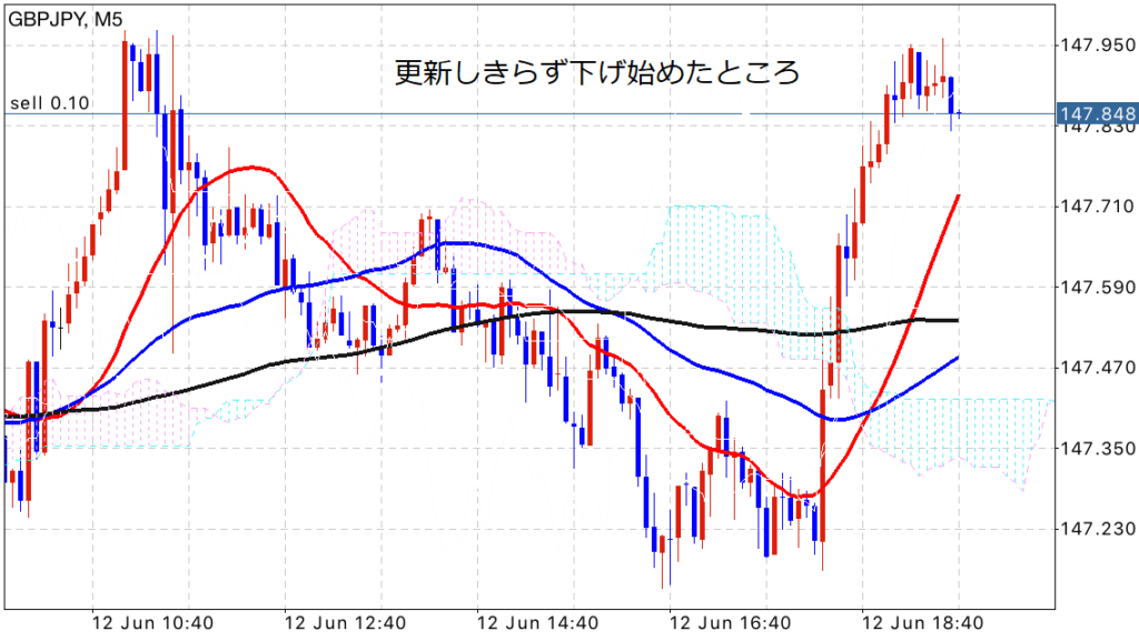 短期足でも長めの上ひげ陰線を作って上昇の勢いが収まってきているのでエントリー!