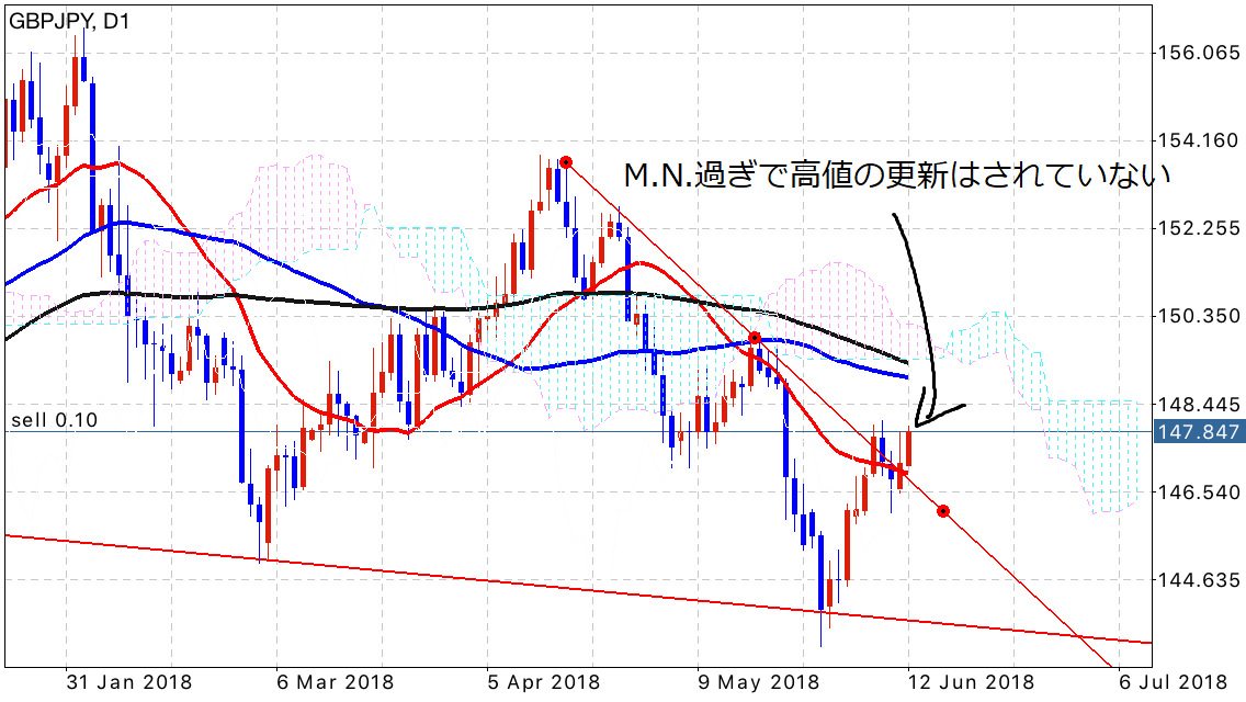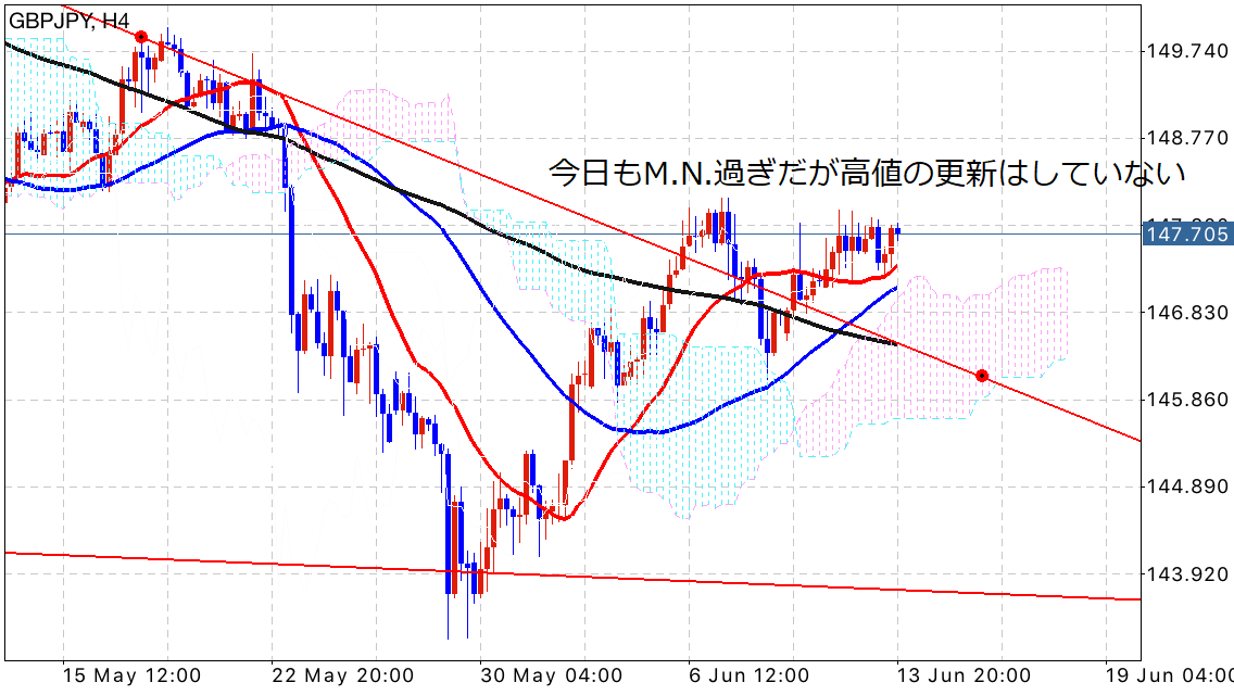個人的にこういった上値を追っている段階の相場で、M.N.過ぎまでに大した更新がされていなかったら一旦下げてくることが多いと感じています。