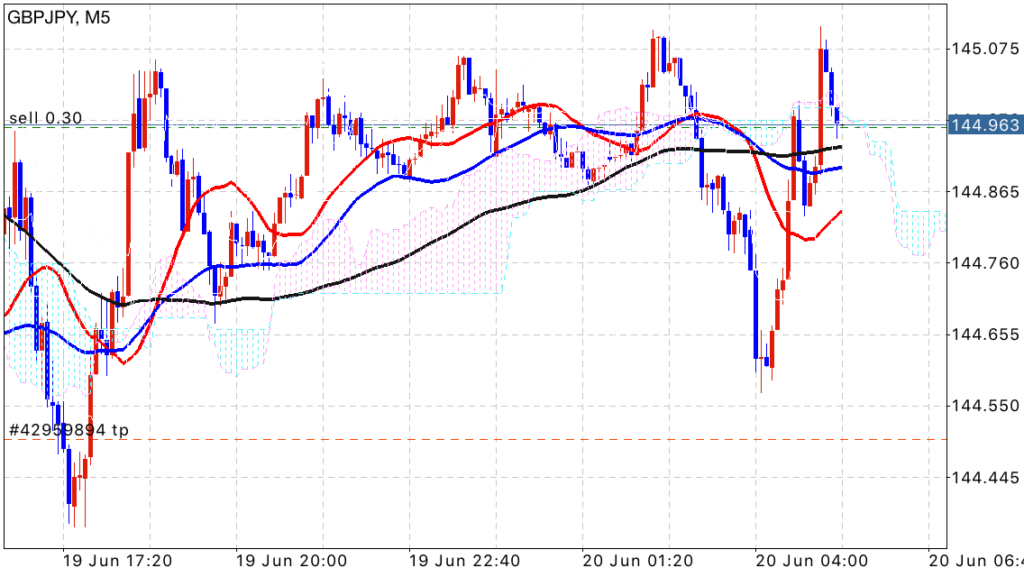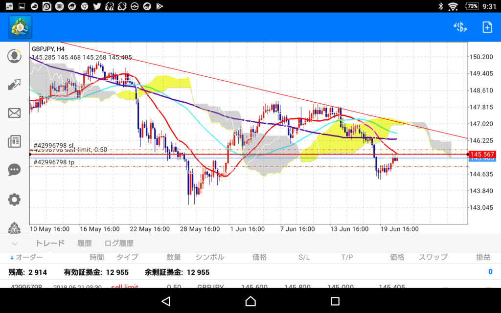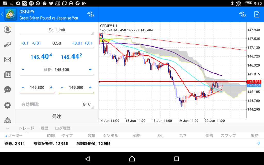 しかし、中途半端なポイントで仕掛けるとちょっとしたもみ合いの中で損切りを喰らってしまうかもしれないので、指値売りを仕掛けて少しでも良いポイントで勝負をしたいと思います。