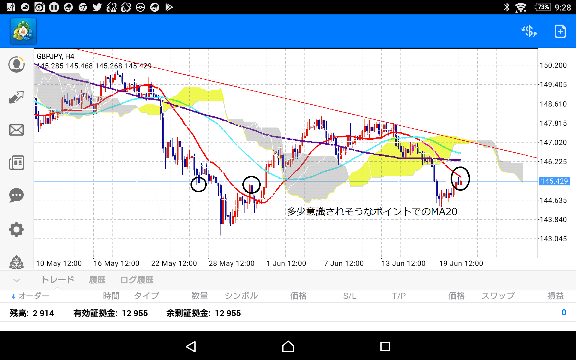 目線は下げになっている場面で、レジサポ気味なポイントとMA20とのマッチングポイント!