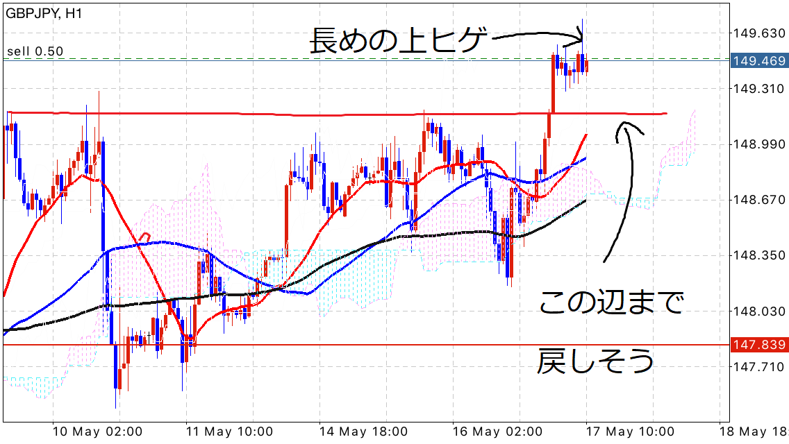 直近は抵抗となりそうなレジサポラインをブレイクしてどんどん上に進んでいきそうだが、最近の欧州タイムでのポンド売りの流れが強いのか長めの上ヒゲを作っていたので抵抗体くらいまで一回戻してきそうと思いました。